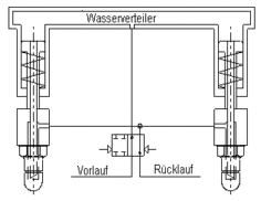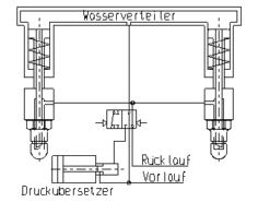 Das Kühlwasser fließt von einer Vorlaufleitung über ein 4/2-Wegeventil durch den Schweißzylinder und den Elektrodenschaft zurück zum 4/2-Wegeventil und in die Rücklaufleitung. Wenn die Schweißmaschine vorfährt, wird der Wasserfluss durch das 4/2-Wegeventil abgesperrt. Jetzt wird das eingeschlossene Wasser als Hydraulikstütze zum Kraftausgleich genutzt. Die Schweißkraft erzeugt die Schweißmaschine. Nach dem Schweißen wird der Kühlwasserfluss wieder freigegeben und der Schweißzylinderkolben wird durch den Wasserdruck und die Feder in die Ausgangsstellung gebracht.